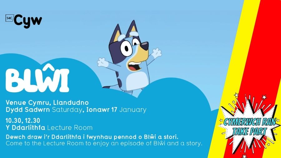 Dewch draw i’r Ddarlithfa i fwynhau pennod o Blŵi a stori! Come to the Lecture Room to enjoy an episode of Blŵi and a story